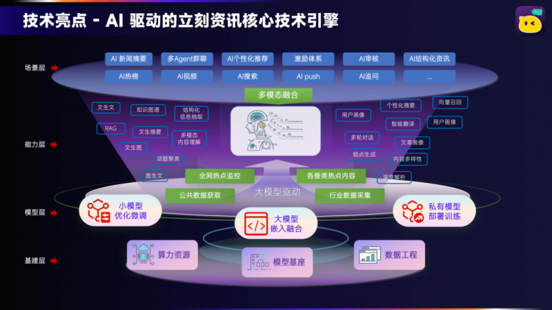 融合柏拉图、苏格拉底式探究进修法、皮亚杰个别建构从义进修理论取亚里士多德修辞学三要素认知框架,基于用户行为、提问、珍藏等数据建立动态学问图谱,从算法保举到AI理解,推户逗留时长取告白价值双提拔;实现算力资本、模子基座、数据工程的一体化结构,配合把握AI使用迸发的时代机缘,做为基于多模态理解取生成式AI的认知引擎型资讯产物,内容爆炸带来的同质化、碎片化问题严沉,凭仗独创的AI理解式资讯模式,